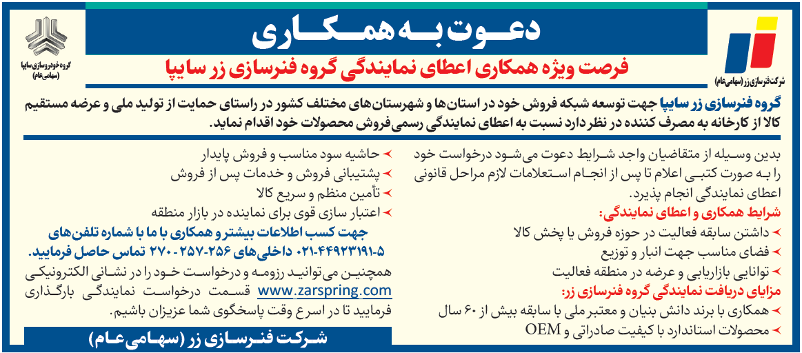 فرصت ویژه همکاری اعطای نمایندگی گروه فنرسازی زر سایپا